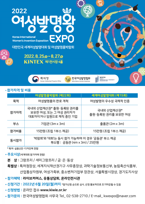 ‘2022 여성발명왕엑스포’는 전 세계 여성들이 출품한 아이디어 발명품을 심사해 수상작을 선정하는 ‘대한민국 세계여성발명대회’와 국내 여성기업 발명품 전시회인 ‘여성발명품박람회’가 통합된 것으로 오는 8월 25일부터 27일까지 개최된다.