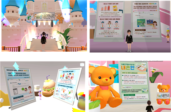 식품안전나라 제페토 월드는 디지털 친화력이 높은 어린이·청소년을 대상으로 식품안전정보를 보다 쉽고 재미있게 전달하기 위한 온라인 서비스 공간으로 식품안전나라 홍보관 게임존 이벤트 광장으로 구성되어 있다.