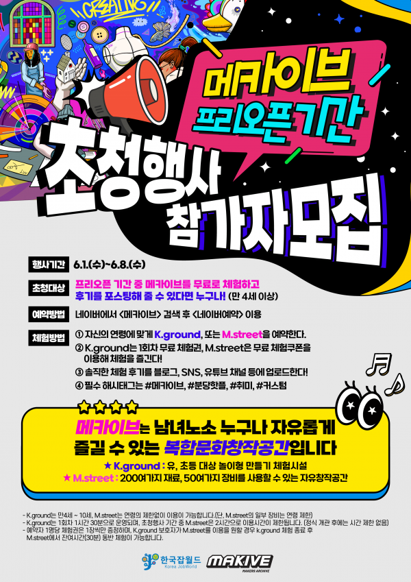 이번 행사는 ‘메카이브’의 어린이를 위한 특별공간 키즈 그라운드와 메이킹 스트리트를 개관 전에 이용해 볼 수 있는 기회다.