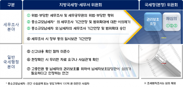 지난 1년 동안 지방청·세무서 납세자보호위원회는 중복조사나 위법·부당한 세무조사 등 납세자의 권리를 침해한 세무조사 23건을 시정조치 했으며 국세청 납세자보호위원회는 지방청·세무서 납세자보호위원회의 심의 결과에 대해 납세자가 이의를 제기한 재심의건 중 13건을 시정조치 해 총 36건을 구제했다.