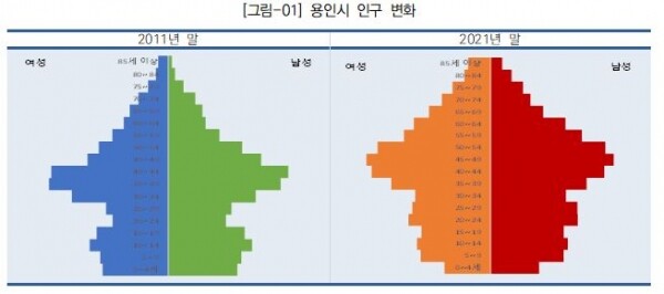 용인시의 인구구조를 2011년 말에서 2021년 말을 비교해보면, 과거의 30~40대 였던 분들이 이제는 50~60대로 올라갔으며 65세 이상 노인인구가 2011년말에 비해서 크게 늘어난 상황이다.