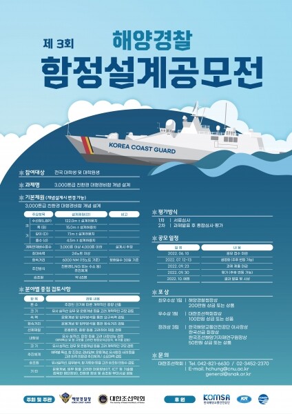 공모전은 차세대 친환경 함정 개선에 대한 청년들의 참신한 아이디어 발굴을 위해 마련된 것으로 조선해양공학 학술분야에 70년 전통을 가진 대한조선학회가 행사를 주관한다.