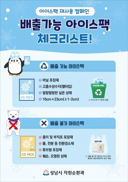 성남시 자원순환과 관계자는 “가정에서 버려지는 아이스팩을 모아 배출할 수 있도록 수거함을 확대 설치하고 제공 업체도 늘렸다”며 “환경오염 예방과 생활 쓰레기 감축에 협조해 달라”고 말했다.
