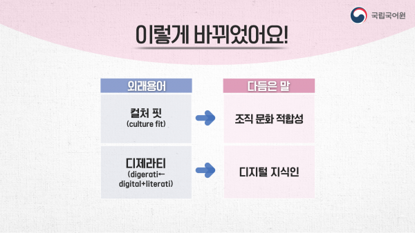 문체부와 국어원은 ‘컬처 핏’처럼 어려운 용어 때문에 국민이 정보에서 소외되지 않도록 ‘조직 문화 적합성’과 같이 쉬운 말로 발 빠르게 다듬고 있다.