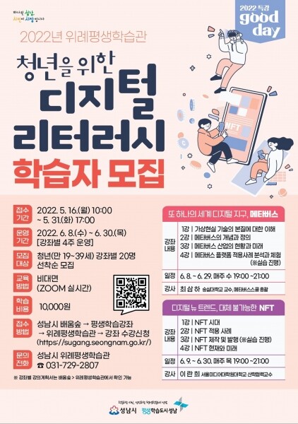 수강 신청하려면 오는 5월 31일까지 성남시 평생학습 포털 배움숲→ 위례평생학습관)을 통해 선착순 접수하면 된다.