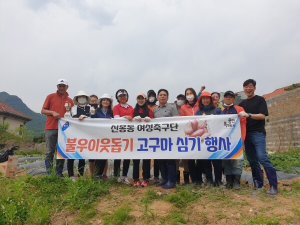 여성축구단원을 비롯한 동 직원 등 20여명은 지난 18일 신봉동 소재 약 200여평 규모의 텃밭에 고구마 모종 1500개를 심었다.
