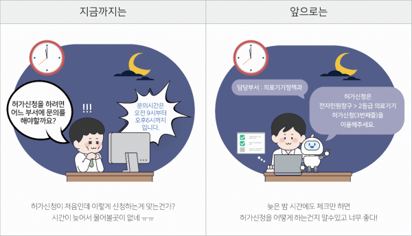 인공지능 챗봇을 활용하면 제품 개발 업체는 의료기기 해당 여부, 제품 인허가·심사 신청 시 처리부서 등을, 의료기기 사용 국민은 안전성 정보 등을 편리하게 확인할 수 있다.
