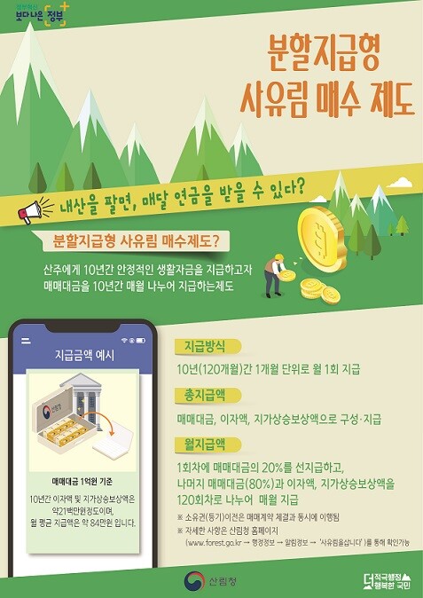 ‘분할지급형 사유림매수 사업’이란 매매대금을 일시에 지급하지 않고 10년간 매월 분할해 지급하는 제도이다.