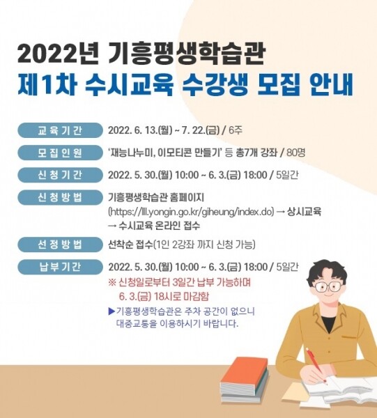 모바일이나 PC로 기흥평생학습관 홈페이지에 회원가입한 뒤 수시교육 접수 코너에서 신청하면 된다.
