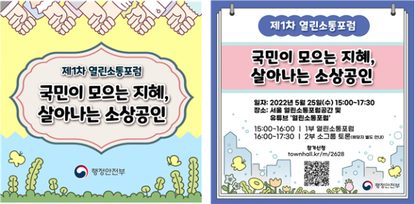 행정안전부는 5월 25일 오후 3시 정부서울청사 별관 1층, “국민이 모으는 지혜, 살아나는 소상공인”을 주제로 2022년 제1차‘열린소통포럼’을 개최한다고 밝혔다.
