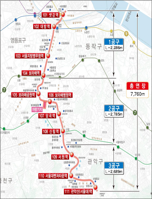 신림선은 지하철 9호선 샛강역부터 1호선 대방역, 7호선 보라매역, 2호선 신림역을 거쳐 관악산역을 연결하는 총 연장 7.76km, 11개 역사로 구성된 노선으로 ‘17년 3월 착공해 5년 3개월만에 개통된다.