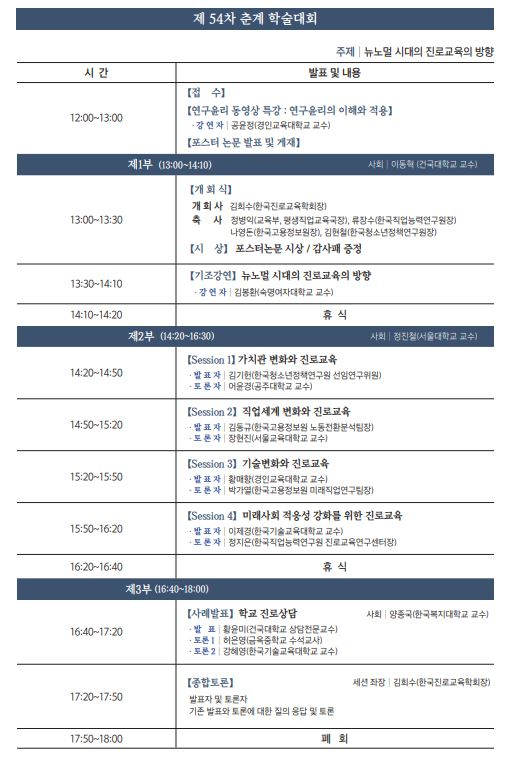 이번 학술대회는 인원 제한 없는 대면행사로 진행되며 ‘뉴 노멀 시대의 진로교육의 방향’을 주제로 숙명여자대학교 김봉환 교수가 기조 강연을 시작해 가치관·직업세계·기술변화와 진로교육 미래사회 적응성 강화를 위한 진로교육 학교 진로상담 사례 등이 논의된다.