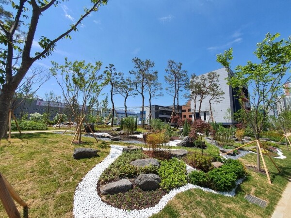 A사가 7억원을 들여 조성한 이 공간에는 소나무, 느티나무 등 16종의 교목 258주와 영산홍, 맥문동 등 관목 및 초화류 14종 3만6600본을 비롯해 암석원과 황토길이 설치됐다.