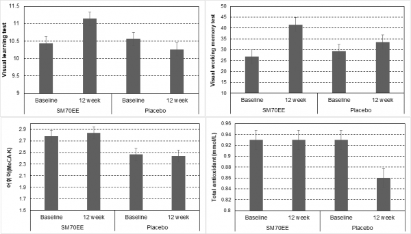 또한, 70대 이상 인지기능 저하 환자 180명을 대상으로 2차례에 걸쳐 SM70EE의 효능을 분석한 결과, SM70EE를 3개월 이상 지속적으로 섭취한 환자의 경우 미섭취 환자에 비해 시각기억, 시지각작업기억, 어휘력 등이 30~50% 이상 뚜렷하게 개선됐다을 확인했다.