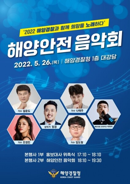 이날 음악회에는 설운도, 조정민, 나태주 등 인기 가수와 성악가 정경 교수가 해양경찰 홍보대사로 신규 위촉되어 홍보대사로 활동 중인 임도형과 의무경찰로 복무 중인 래퍼 비와이와 함께 무대를 꾸민다.