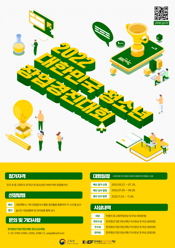 정병익 교육부 평생직업교육국장은 “미래 사회의 주역이 될 청소년들의 도전 정신과 뜨거운 열정을 응원하며 앞으로도 청소년들이 스스로 자신만의 진로를 개척하는 힘을 키울 수 있도록 다양한 창업체험 교육을 활성화 하겠다”고 말했다.