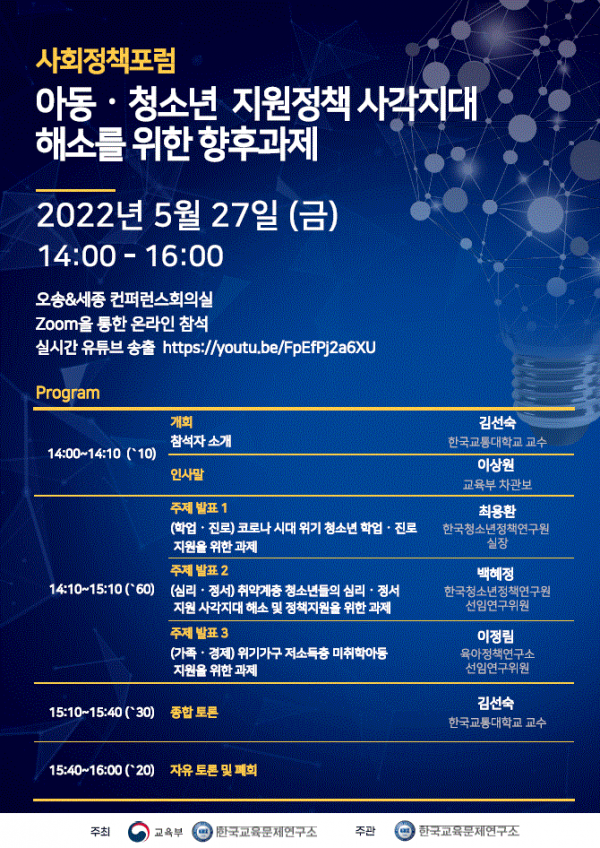 이상원 교육부 차관보는 “아동·청소년들의 안전하고 건강한 성장을 위해서는 각 영역의 개별 서비스 이외에도 종합적 관점에서 학업·진로 심리·정서 가족·경제 등을 촘촘하게 살펴보고 상호 연계·협력하는 등 통합적 지원방안 마련이 필요하다”고 강조하며 “이번 토론회에서 논의한 내용이 학교 안팎의 경계, 부처 간 칸막이를 넘어 아동·청소년 지원정책의 사각지대를 최소화하고 맞춤형 지원을 강화하는 데 기여하길 바란다”고 밝힐 예정이다.