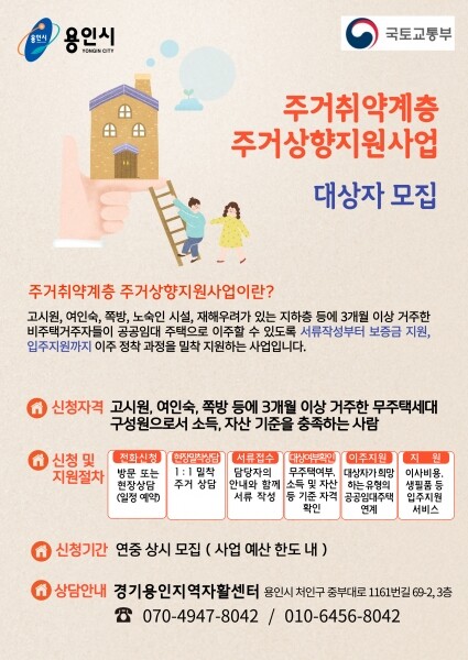 용인시는 열악한 환경에서 생활하고 있는 가구를 찾아 공공임대주택으로 입주하도록 돕는 ‘주거상향지원사업’을 추진한다고 2일 밝혔다.