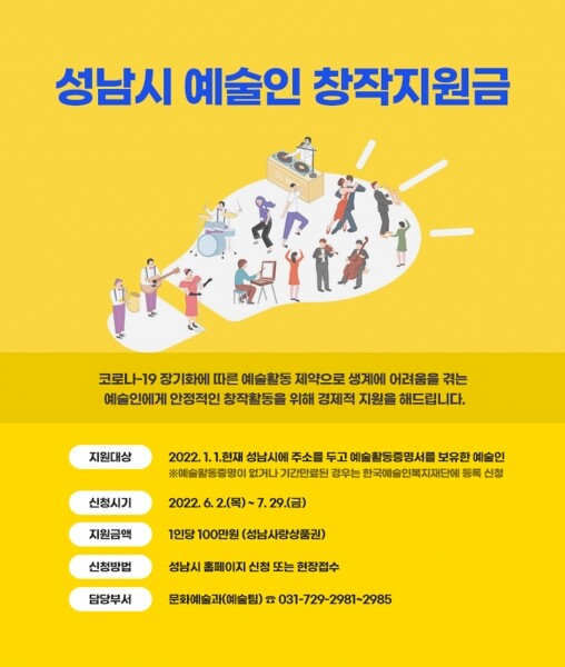온라인 신청이 어려운 경우 지원신청서 예술활동증명서 주민등록초본을 성남시청 6층 문화예술과에 직접 내면 된다.
