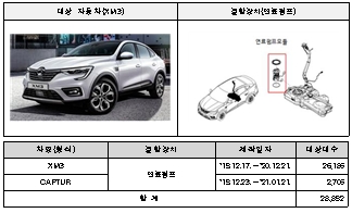 첫째, 르노코리아자동차㈜에서 제작 또는 수입·판매한 XM3 등 2개 차종 28,892대는 ‘20년 7월부터 연료펌프 내 일부 부품의 손상에 의한 시동 꺼짐 가능성으로 시정조치를 실시했으나, 시정조치 후에도 동일 현상이 발생해 추가 개선된 부품으로 교체하는 시정조치에 들어간다.