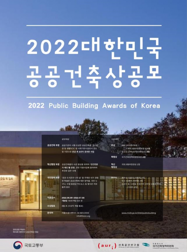 6월 9일부터 7월 8일까지 신청할 수 있으며 공공건축 부문은 담당자 메일로 접수하고 국민참여 부문은 2022 공공건축상 누리집 또는 담당자 메일로 접수하면 된다.