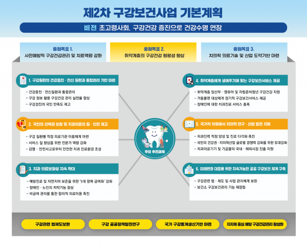 이러한 정책 여건·변화 분석을 토대로 마련된 제2차 기본계획은 ‘초고령화 시대, 구강 건강증진으로 건강수명 연장’이라는 비전하에 ‘사전예방적 구강 건강관리 및 치료역량 강화’, ‘취약계층의 구강 건강 형평성 향상’ 및 ‘치의학 의료기술 및 산업 도약 기반 마련’을 중점목표로 해 총 6개 분야 17개 과제를 제시했다.