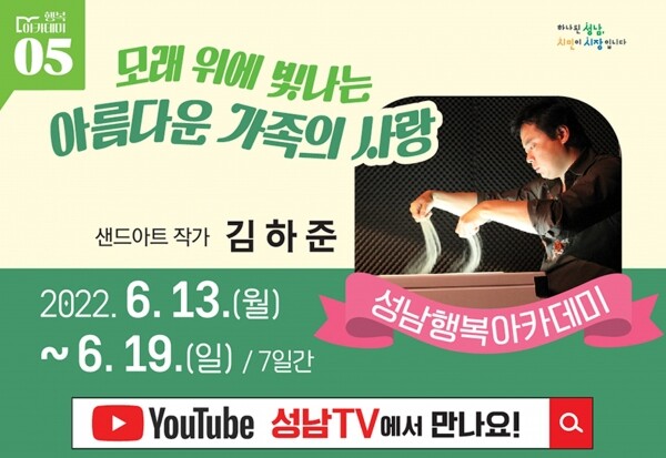 이 기간 ‘모래 위에 빛나는 아름다운 가족의 사랑’을 주제로 한 김하준 작가의 모래 예술 강연을 시 공식 유튜브 ‘성남TV’로 시청할 수 있다.
