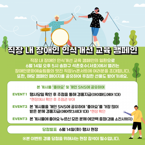 ‘직장 인 콘서트’는 많은 시민이 참여할 수 있도록 서울 송파구 석촌호수 수변무대에서 오후 5시부터 두 시간 가량 이어지며 현장에서 아이패드, 에어팟 등 다양한 경품도 증정할 예정이다.