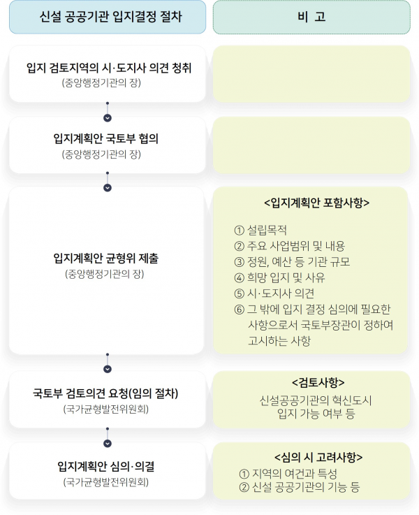 중앙행정기관의 장은 앞으로 공공기관을 설립하거나 신규 인가 시 비수도권으로의 입지를 우선 고려해야 하며 입지로 검토되는 지역의 시·도지사의 의견을 청취해 입지계획안을 마련한 후, 국토교통부장관 협의 및 국가균형발전위원회 심의·의결을 거쳐 입지를 결정해야 한다.