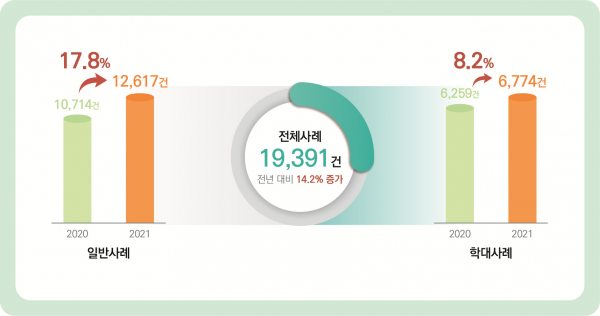 2021년 한 해 동안 전국 37개 지역노인보호전문기관을 통해 신고된 건수는 19,391건이고 이 중 학대사례로 판정된 건수는 6,774건으로 나타났다.