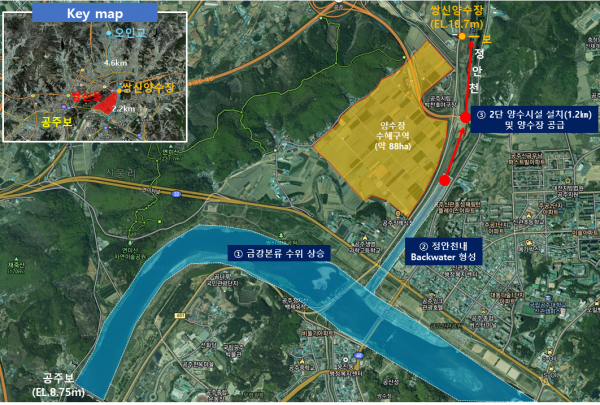 한국농어촌공사에서는 정안천 수위가 확보되면 하류에서 상류로 2단 양수 하는 시설을 임시로 설치해 쌍신양수장 취입보에 물을 채운 후 공주 쌍신뜰 지역 등에 농업용수를 공급할 계획이라고 전했다.